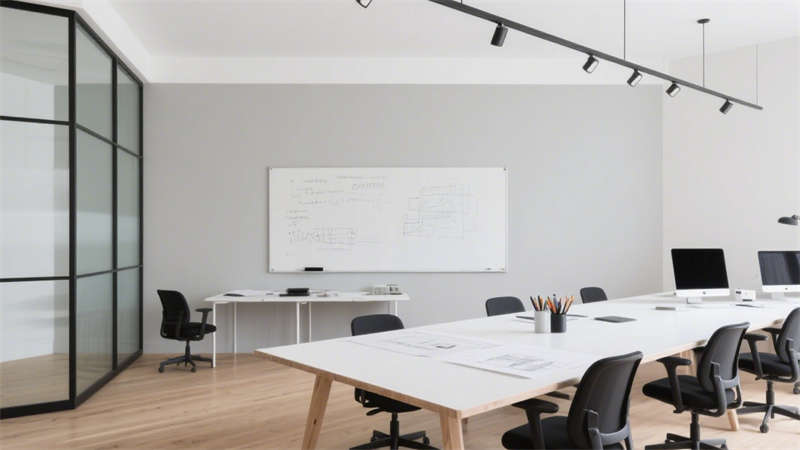 本设计延续现代极简主义风格,以高级灰与白色为基底,巧妙融入原木色元素,让整体空间既显简洁利落,又不失温润质感??占洳季肿⒅毓δ苄杂胧媸识鹊钠胶猓鹌痹幼笆?,用流畅的线条和通透的格局,营造出开阔明亮的办公氛围。?