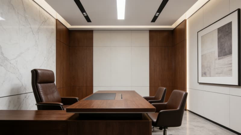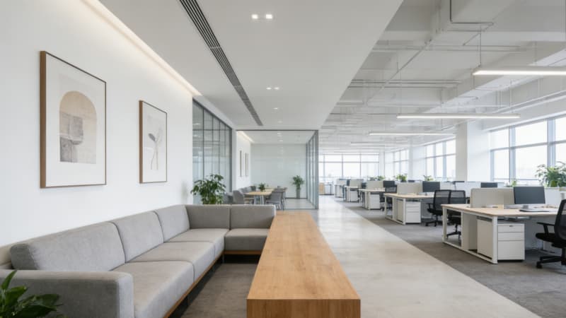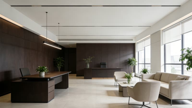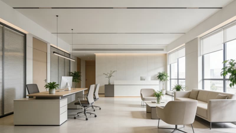 本项目为4000㎡现代简约风格办公空间,整体以简洁线条、低饱和度色调与通透布局打造高效、舒适、大气的办公环境。大楼外观简约大气,凸显企业形象;大堂开阔明亮,质感材质与简约造型相得益彰;待客厅雅致静谧,兼顾接待功能与商务格调;电梯间整洁统一,提升通行体验??攀桨旃智侠?,采光充足,兼顾协作与私密性,满足不同团队办公需求;经理办公室与总裁办公室沉稳大气,功能齐全,在简约中彰显品质与格局。项目从外观到室内空间一脉相承,统一现代简约设计语言,注重实用性、舒适性与美学感,打造集办公、接待、洽谈于一体的现代化商务空间,助力企业提升形象与办公效率。