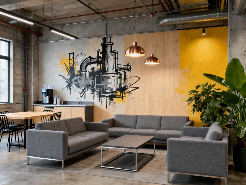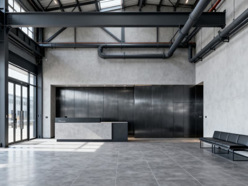 本设计聚焦6000平厂房的工业属性与实用需求,以现代工业风为核心,打造高效、规范且兼具人文关怀的生产办公空间。整体色调以深灰、浅灰、黑色为主,搭配局部橙色警示色与浅木色暖调,既契合工业空间的专业质感,又避免环境的冰冷与压抑。