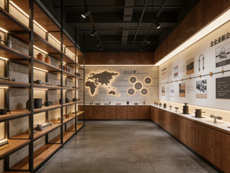 成品展示区的设计别出心裁,运用木质与金属组合的展示架,通过灯光的巧妙布置,突出产品特点。背景墙采用艺术化的设计,展示企业发展历程与产品理念,为展示区增添文化氛围。