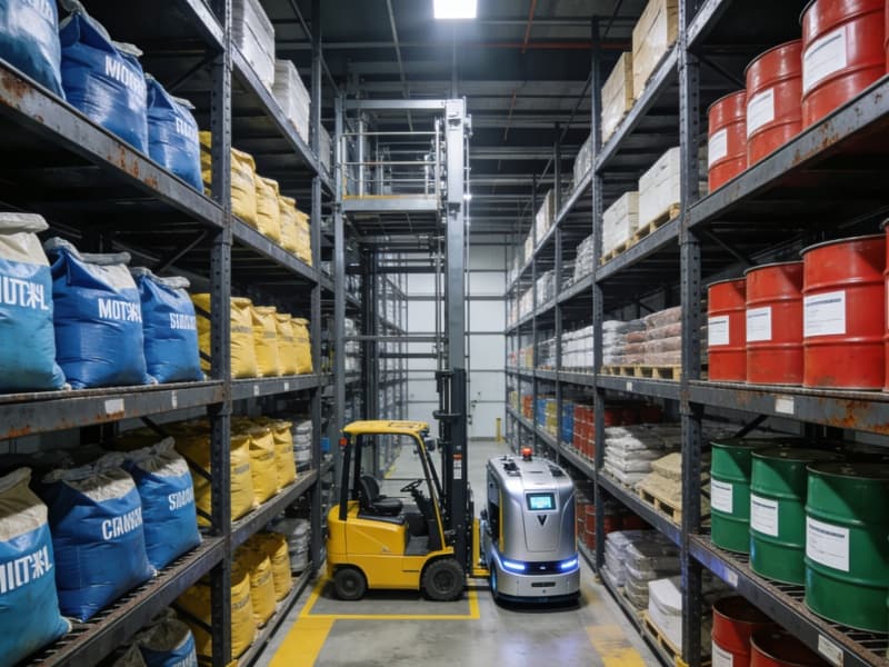 原料存储区采用多层金属货架,实现空间的最大化利用。不同类型的原料分区明确,标识清晰,方便管理与取用。同时,配备先进的搬运设备,提高货物搬运效率。
