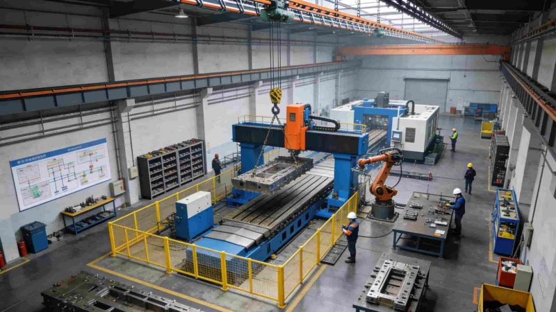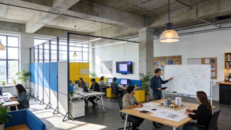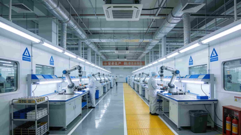 生产区域按需分区:十万级洁净电子车间以灰白为主调,配备自动化流水线与防静电系统;重型设备组装车间采用耐磨地坪与行车轨道,色彩对比鲜明。办公区域兼顾协作与专注,开放式卡位、创意办公区与研发专注舱合理布局,裸顶工艺、原木元素与绿植点缀,平衡工业感与舒适度。