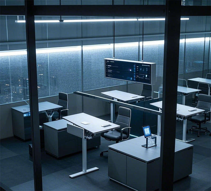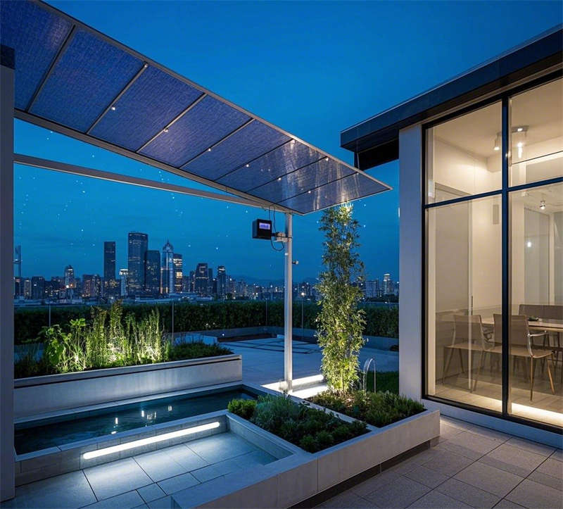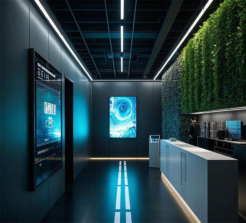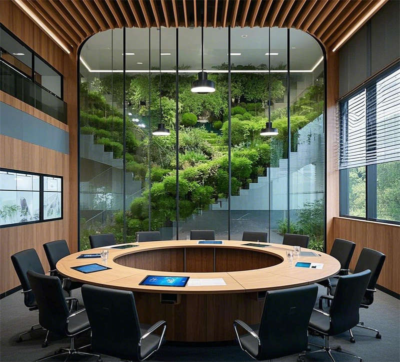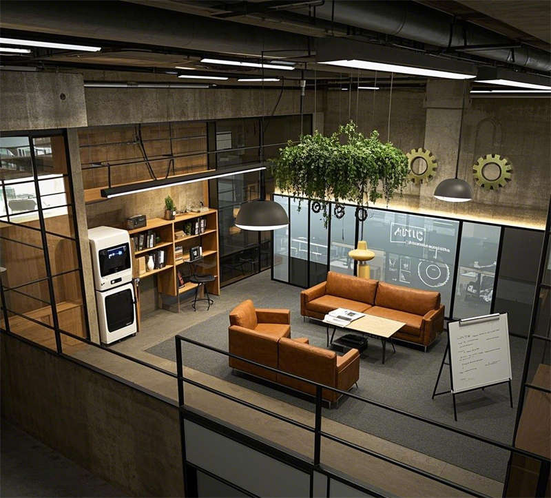 本设计充分考虑了办公楼的不同功能区,包括大堂、开放式办公区、会议室、休息区、经理办公室、多功能厅、走廊和休闲露台。每个区域有不同的设计重点,希望展示现代、科技感,同时兼顾舒适和环保,还要注意空间布局,比如开放式办公区的协作性,会议室的隔音和多媒体设备,休息区的放松氛围。