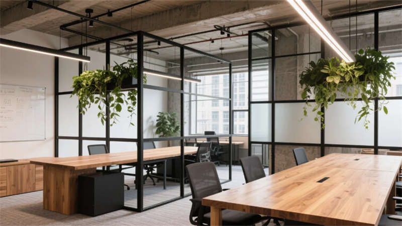 该办公空间以暖调轻工业风为灵魂,将冷峻的金属骨架与温润的竹木元素交织,在微水泥的灰调基底上铺陈出理性与感性的平衡??虐旃杪涞卮耙馊胧遥讨睬接牍斓赖拼鹆鞫男鞒【?;独立专注舱与水吧区形成动静分区,满足深度思考与即时社交的双重需求。