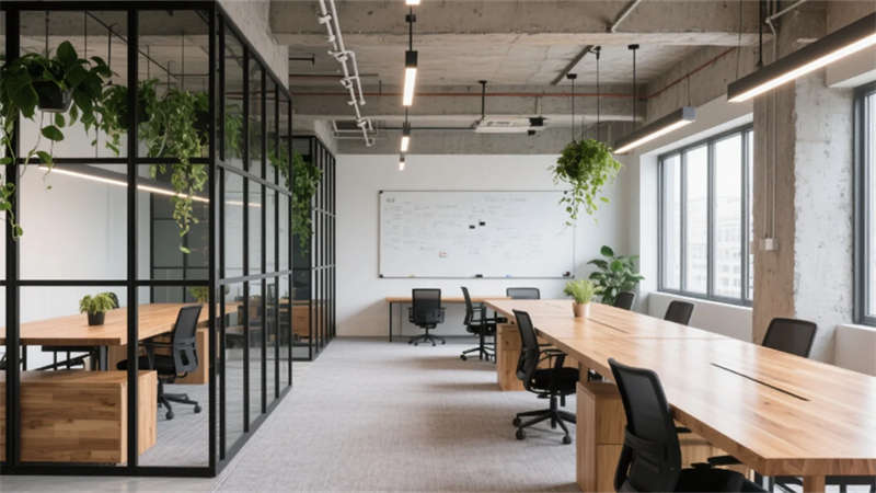 设计从本土气质中汲取灵感:图书角的阶梯书屋如皖北梯田般层叠上升,生态休闲区的苔藓墙面呼应淮北平原的绿意,竹木色调贯穿始终,在工业框架中注入自然呼吸感。创意沙龙区采用可重组家具,鼓励思维碰撞;而半透明的会议室隔断则隐喻开放沟通的企业精神。