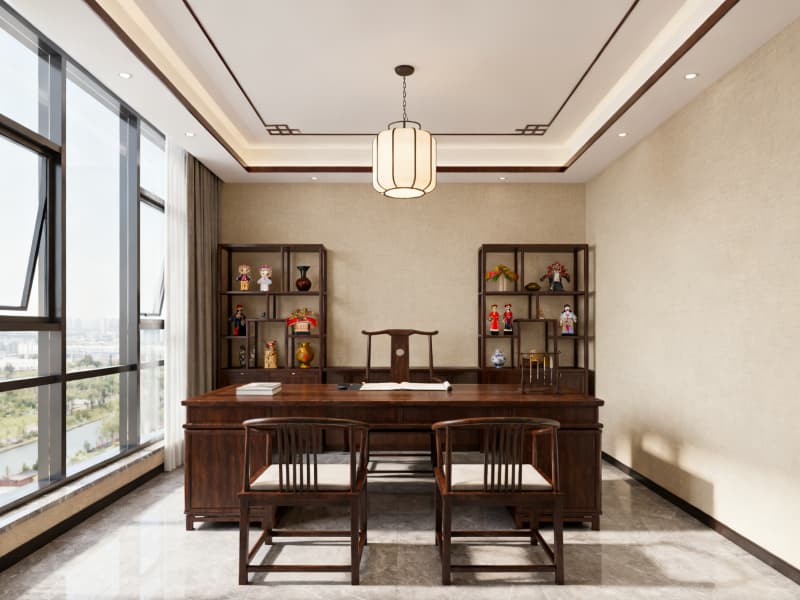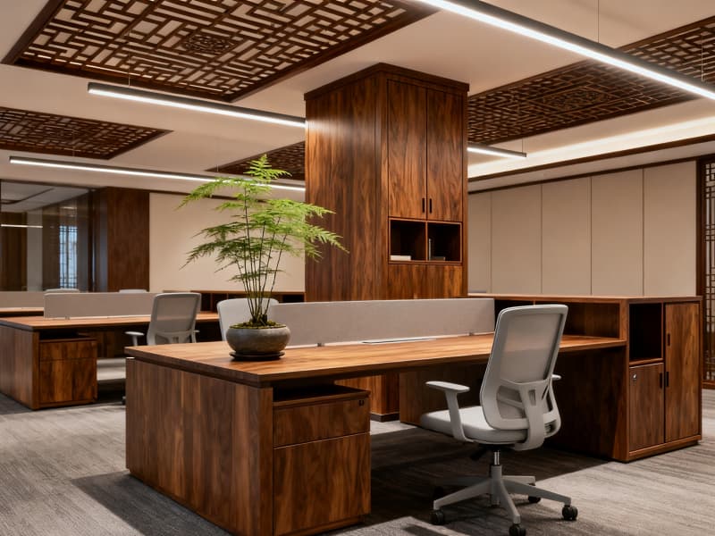 空间布局上,科学划分开放办公区、独立办公室、会议室、休闲区等功能区域,优化动线设计,保证办公效率与使用舒适度。色彩以浅色系为基底,搭配深棕色实木元素,营造雅致、沉稳的视觉效果,同时通过落地玻璃窗、中式格栅吊灯等设计引入充足自然光线,减少空间压抑感。